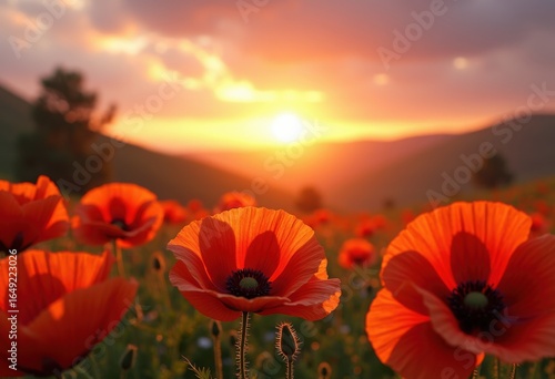 vibrant poppy petals gorgeous sunset skyline nature bloom flowers, landscape, evening, dusk, colors, red, garden, wildflower, blossom, crops, blooming