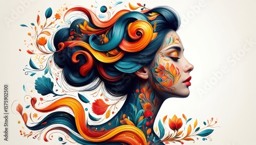 Vibrant Portrait of a Woman Adorned with Intricate Multicolored Floral Patterns and Flowing Hair, Capturing the Essence of Artistic Self-Expression