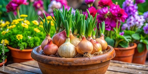Vibrant pot of growing onions surrounded by colorful flowers, showcasing the beauty of gardening and nature's bounty.