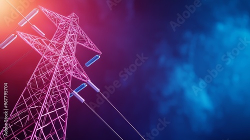 Vibrant power line tower illuminated with colorful neon lights against a dark sky, symbolizing energy and technology.