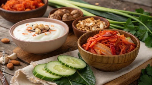 Vibrant probiotic-rich foods on display, including yogurt and more.