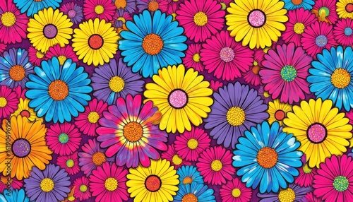 Vibrant psychedelic illustration features colorful tie-dye daisies. Retro hippie style with groovy 60s and 70s floral patterns evokes peace and love. Perfect groovy background for summer festivals.