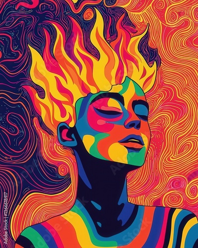 Vibrant psychedelic portrait with flame-like hair in swirling abstract patterns
