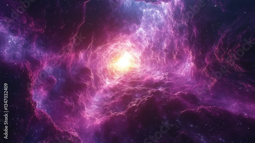 Vibrant purple and pink nebula with bright core, cosmic clouds and stars.