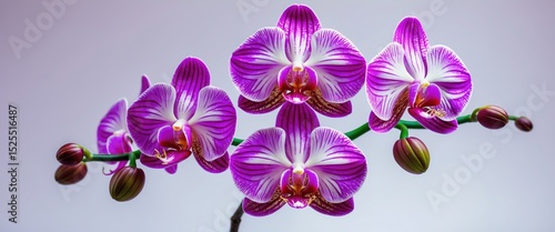 Vibrant purple and white orchids with buds on a stem, showcasing detailed petals and floral beauty.