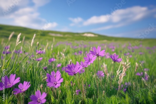 Vibrant purple flowers in a green grassland. A serene and lively springtime scene.