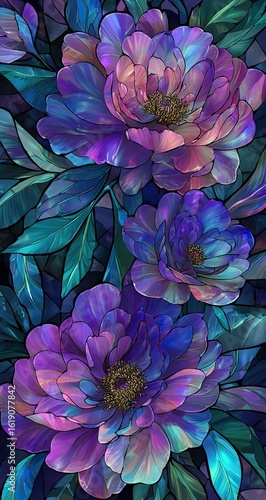 Vibrant purple peonies, stained-glass style, close-up, dark background, phone wallpaper