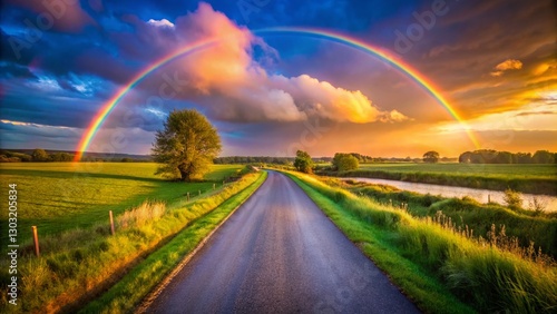 Vibrant Rainbow Arcing Over Rural Asphalt Road at Sunset