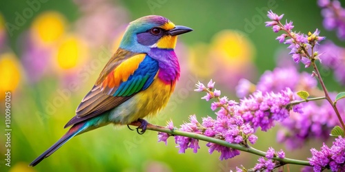 Vibrant Rainbow Bird Perched Gracefully on a Branch Adorned with Delicate Purple Blossoms in a Lush Garden Setting