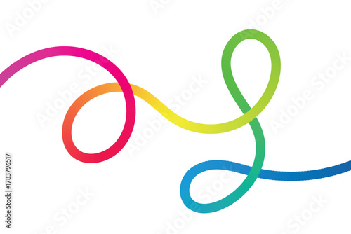 Vibrant rainbow colored flexible tube curving and looping against white background