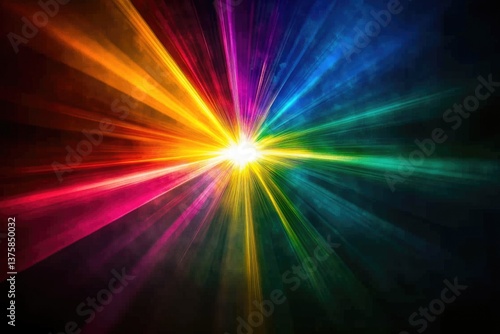 Vibrant rainbow laser light burst exploding from central point, radiating outwards.