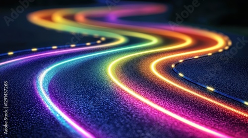 Vibrant Rainbow Neon Lights Trail on Dark Asphalt Road Abstract Background