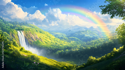 Vibrant rainbow stretches across rolling hills with lush green forests and waterfall, creating breathtaking natural landscape. Rainbow Valley. Illustration