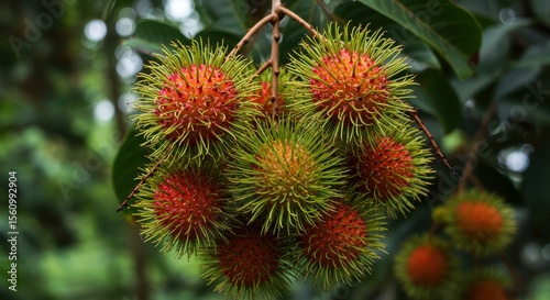Vibrant Rambutan Fruits Hanging on Tree Branch in Lush Greenery Background