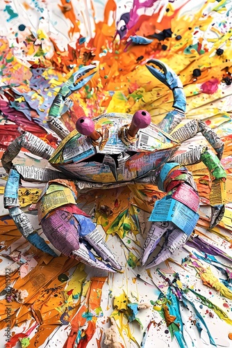 Vibrant Recycled Paper Mache Crab Art Colorful Abstract Seascape Mixed Media Artwork