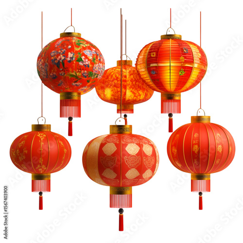 Vibrant red and gold Chinese lanterns illuminate against a transparent background, radiating festival atmosphere with intricate artistic design.