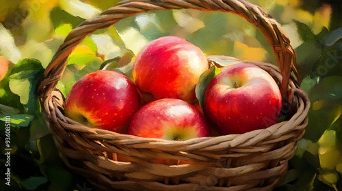 Vibrant Red and Golden Apples in a Woven Basket with Impressionist Lighting