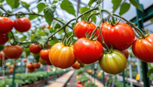 Vibrant Red and Green Tomatoes Growing on a Branch in a Greenhouse Setting