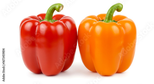 Vibrant red and orange bell peppers with fresh green stems presented on a clean white background