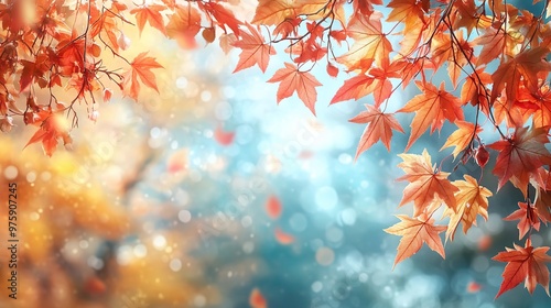 Vibrant red and orange maple leaves against a soft blue and yellow bokeh background.
