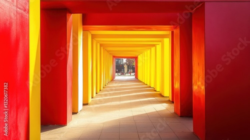 Vibrant red and yellow cube structures form a tunnel-like archway, leading to a bright empty background.