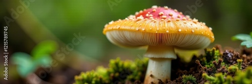 Vibrant red and yellow mushroom growing amidst lush green moss.