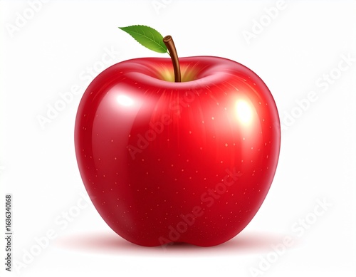 Vibrant red apple with a green leaf and stem, casting a subtle shadow on a white background, showcasing its glossy skin.