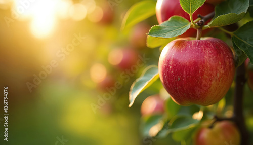 Vibrant red apples hanging on tree branches in orchard. Healthy fruit, vitamins, antioxidants. Fresh apples, autumn season, harvest time. Eco friendly food. Agricultural concept, farming. Tasty ripe