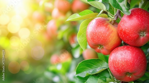 Vibrant red apples with water droplets, hanging from a tree branch, with a blurred green background