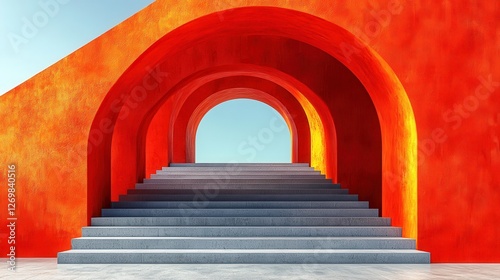 Vibrant Red Archway with Concrete Steps in Minimalist Design