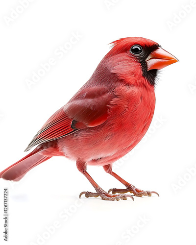 Vibrant red cardinal perched on a white background, showcasing its bright plumage and distinctive black facial markings.