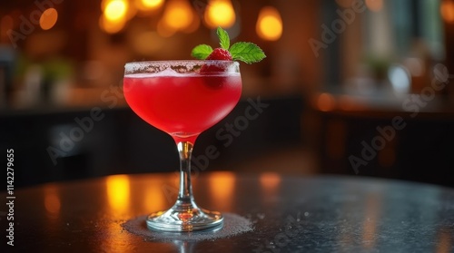 Vibrant Red Cocktail in a Coupe Glass with Sugar Rim and Garnish