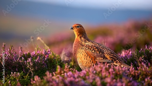 Vibrant Red Grouse in Lush Heather Moorland A Majestic Moment Captured Amidst the Scottish Highlands at Sunrise