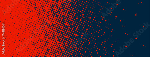 Vibrant red halftone dots fade into dark blue background. Vector illustration with bold comic-inspired gradient effect.
