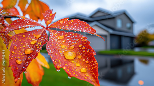 Vibrant red leaf with dewdrops, showcasing autumn beauty near house. scene captures essence of nature transition, reflecting serene atmosphere
