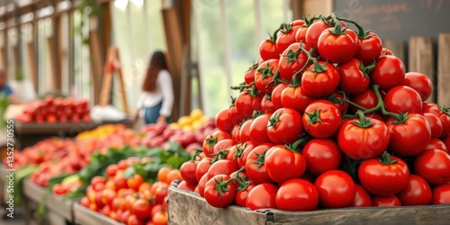 Vibrant red organic tomatoes stacked high at a rustic farm stand, farming, natural