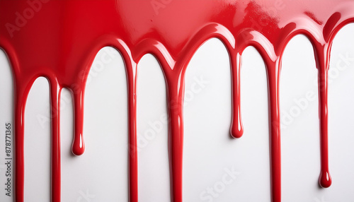 Vibrant red paint dripping on white background. Fresh bright paint flowing down. Abstract pattern.