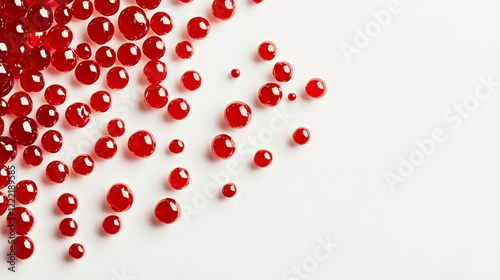 Vibrant Red Round Decorative Beads Scattered on a White Surface for Creative Backgrounds and Crafts Projects, Perfect for Artistic and DIY Applications
