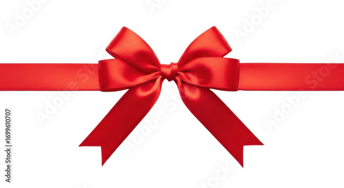 Vibrant red satin ribbon tied into a neat festive bow with elegant tails, on a pure transparent background with copy space, professional studio shot. Concept of celebration and gifting
