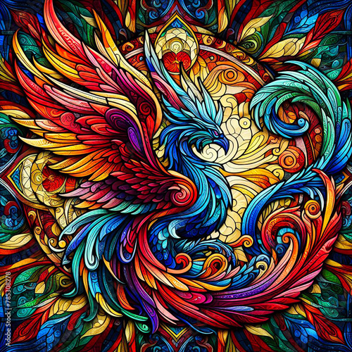 Vibrant Resurrection: A Phoenix Rising in Brilliant Stained Glass Style, Awash in Fiery Hues