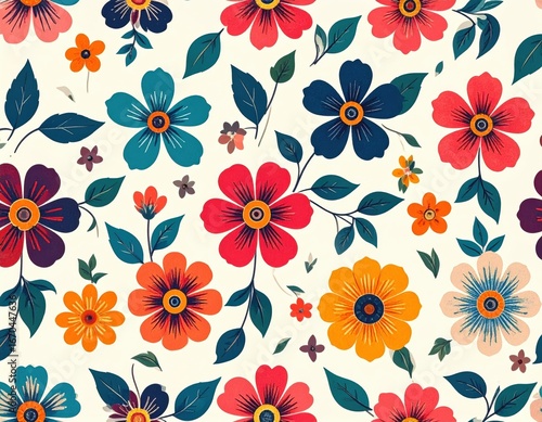 Vibrant Retro Folk Art Floral Pattern with Stylized Colorful Blooms.