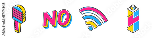 Vibrant retro wifi, microphone, no text and icon set with groovy isometric design for tech and communication themes
