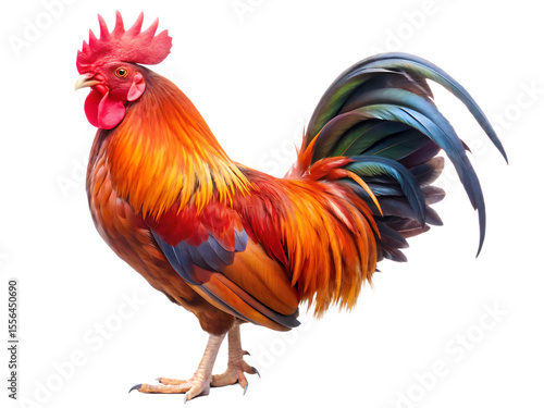 Vibrant rooster with colorful plumage standing proudly isolated on a transparent background bird fowl, PNG