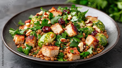 vibrant salad featuring sprouted lentils, Brussels sprouts, and crispy bread cubes
