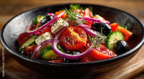 Vibrant salad with tomatoes, cucumbers, olives, red onion, feta, and fresh herbs in a dark bowl