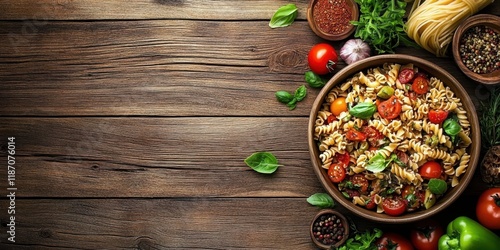 Vibrant salad, wooden rustic table, fresh vegetables, colorful peppers, cherry tomatoes, leafy greens, grated cheese, diced ham, overhead view, natural lighting, textured wood background, healthy meal