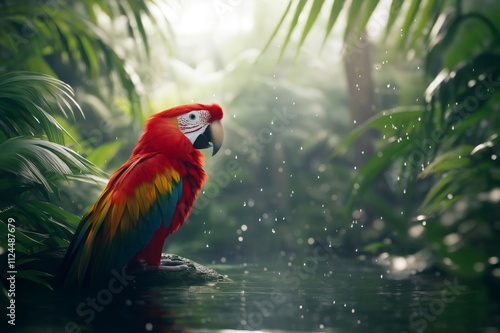 Vibrant scarlet macaw resting in a lush tropical rainforest near a small body of water with light rain falling