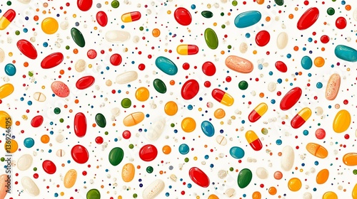 Vibrant Scattered Medication: A Colorful Pill and Capsule Pattern
