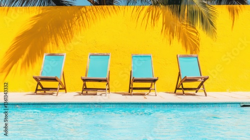 Vibrant scene featuring four blue lounge chairs by a swimming pool against a bright yellow wall, surrounded by tropical palm leaves.