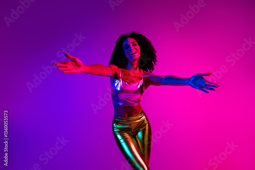 Vibrant Scene of a Stylish Young Woman Dancing in Neon Lights in a Retro-Inspired Setting